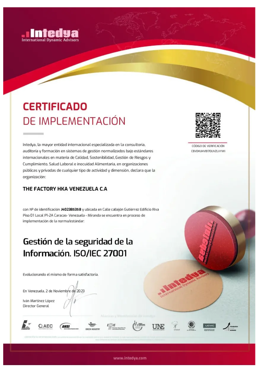 En The Factory HKA República Dominicana entendemos que la confianza es la base de toda relación comercial. Por eso, trabajamos bajo el estándar internacional ISO 27001, que garantiza la seguridad de la información y el cumplimiento de altos estándares de calidad.